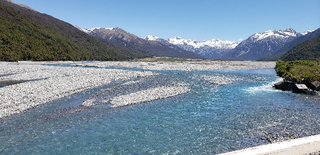 Широкая горная река с галечными отмелями и альпийскими вершинами Южного острова Новой Зеландии — природная зона добычи россыпного золота и проведения туров по gold panning. Авторские туры по добыче золота в Новой Зеландии. Связаться с гидом: WhatsApp +642109071479.