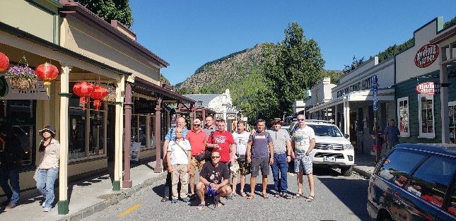Группа путешественников в историческом городке золотой лихорадки Южного острова Новой Зеландии с архитектурой XIX века — маршруты культурных и приключенческих экспедиций по следам первооткрывателей. Тур первопроходцев Новой Зеландии. Связаться с гидом: WhatsApp / Telegram +642109071479.