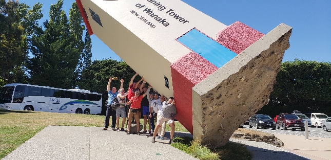 Группа путешественников у знаменитой наклонной башни в Ванаке на Южном острове Новой Зеландии — популярная туристическая достопримечательность региона. Туры по лучшим местам Новой Зеландии. Связаться с гидом: WhatsApp / Telegram +642109071479.