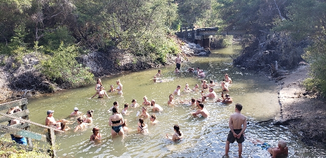 Люди купаются в природных горячих источниках в лесной реке Новой Зеландии — популярная природная достопримечательность и опыт отдыха в дикой природе страны. Туры по лучшим местам Новой Зеландии. Связаться с гидом: WhatsApp / Telegram +642109071479.