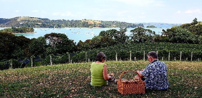 Пара на пикнике с панорамным видом на морской залив с островами и яхтами в Новой Зеландии — живописные прибрежные пейзажи и маршруты путешествий по лучшим местам страны. Туры по лучшим местам Новой Зеландии. Связаться с гидом: WhatsApp / Telegram +642109071479.