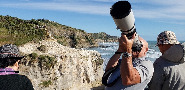 Путешественники наблюдают морских птиц с утёсов океанского побережья Новой Зеландии — впечатляющие прибрежные ландшафты и маршруты дикой природы страны. Туры по лучшим местам Новой Зеландии. Связаться с гидом: WhatsApp / Telegram +642109071479.