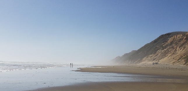 Путешественники гуляют по бескрайнему дикому океанскому пляжу Новой Зеландии среди высоких песчаных утёсов и тумана прибоя. Уединённые природные ландшафты и нетронутая красота страны. Индивидуальные туры и экскурсии по лучшим местам Новой Зеландии: океан, утёсы, дикие пляжи и природные маршруты. Бронирование: WhatsApp / Telegram +642109071479.