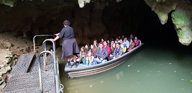 Туристы на лодочной экскурсии внутри известняковой пещеры Вайтомо в Новой Зеландии. Подземная река, сталактиты и знаменитые светящиеся черви glowworms — одно из самых впечатляющих природных чудес страны. Индивидуальные туры и экскурсии по лучшим местам Новой Зеландии: пещеры Вайтомо, Роторуа, озёра и природные достопримечательности. Бронирование: WhatsApp / Telegram +642109071479.