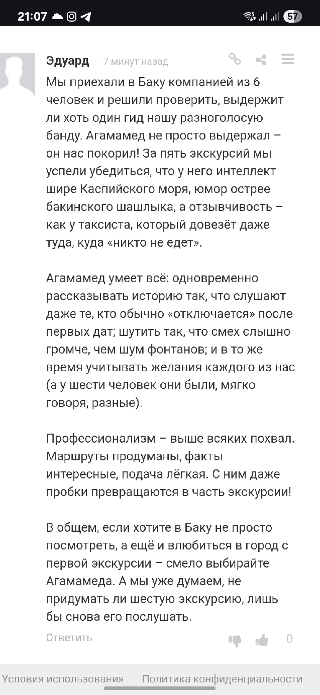 Спасибо вам большое за такие слова! ? С вами было одно удовольствие — энергия у вас сильнее каспийского ветра ? Жду продолжения наших приключений в Баку!