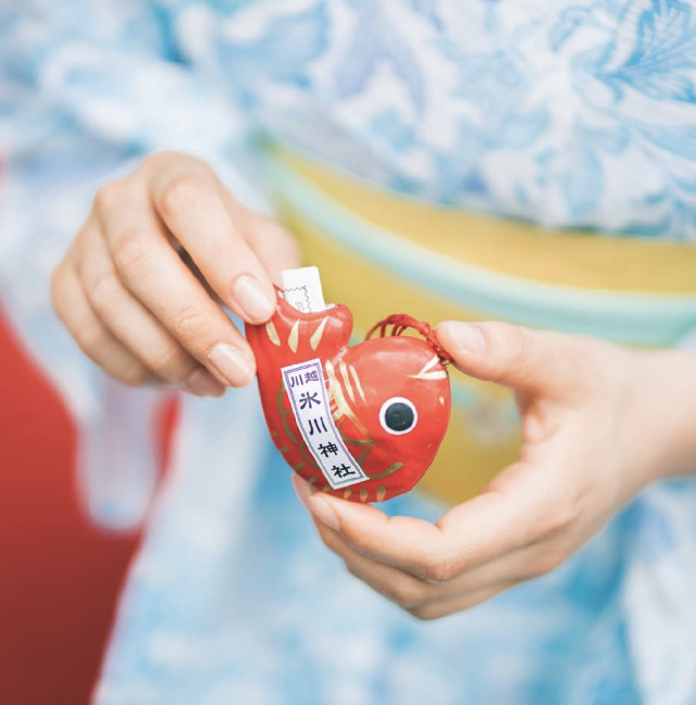 В храме Хикава продаются омикудзи (бумажки с предсказаниями) в форме тай - японского красного морского леща. Эта рыба считается символом удачи и праздника.
