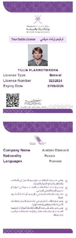 Лицензия гида по всему Оману от мин-ва по туризму Султаната Оман