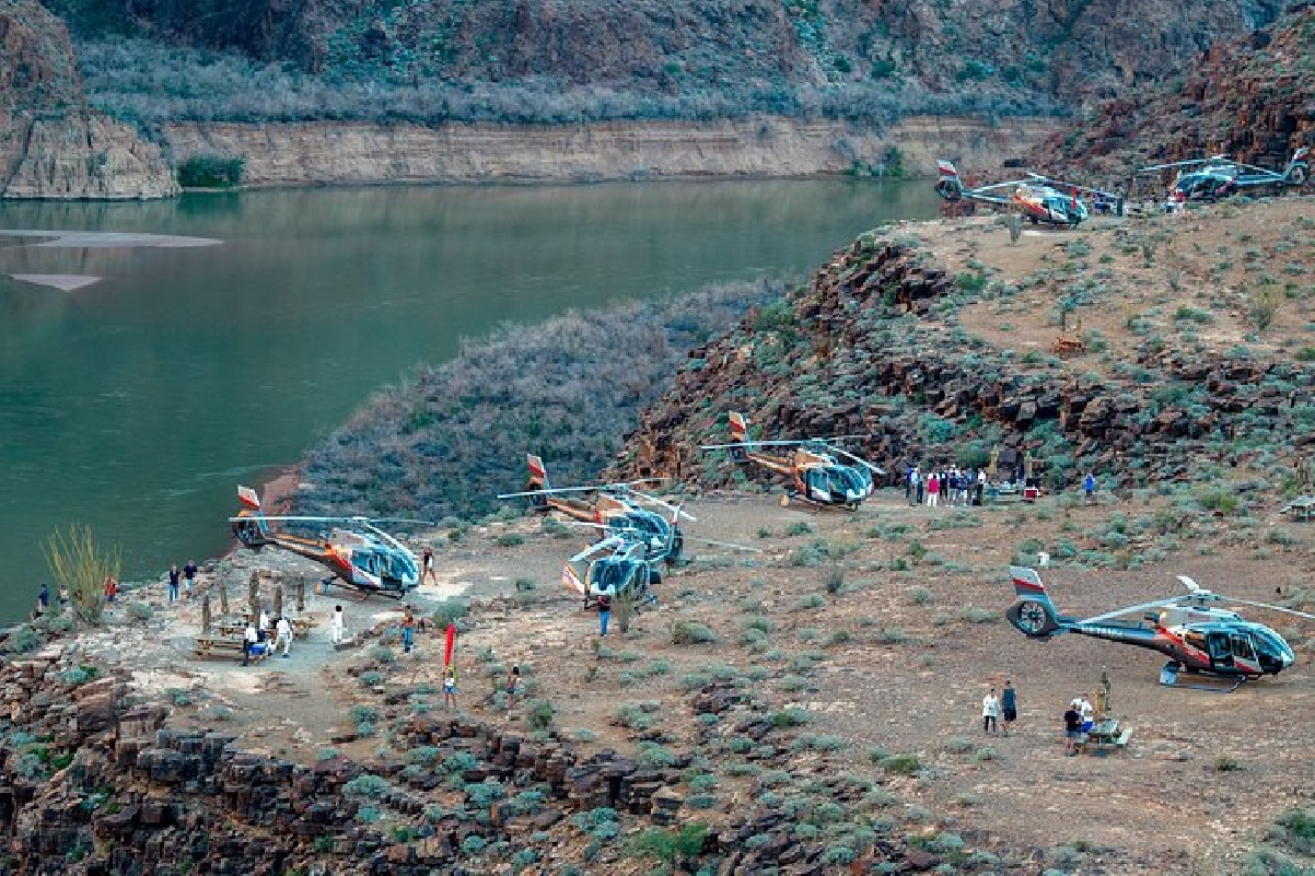 После спуска вертолета на дно Каньона (глубина ~1300 метров), вас ожидает захватывающая прогулка по реке Колорадо на понтонной лодке (15-20 минут).