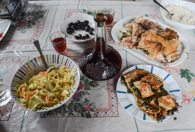 Время близилось к обеду, поэтому гостеприимные хозяева пригласили меня отобедать вместе с ними. Пока Татьяна собирала на стол, мы с Канакисом по критской традиции угостились домашней цикудьей. Хозяйка настаивает ее на ягодах боярышника. Напиток был сорокоградусным, но "проскочил" легко. На обед была сочная домашняя курица, запеченная в духовке с зеленым горошком, критский плов, закуски: салат из баклажан (мелидзаносалата), сырный салат (тиросалата), критский пирог с травой (хортопита), чесночный соус (дзадзики), салат из капусты. О некоторых критских блюдах я услышал впервые. Таня извинилась за то, что, лежавшие на морозильной камере авокадо еще зеленые и поэтому она не смогла сделать салат-авокадо. На десерт хозяйка подала жареные пирожки с творогом (кальцунья), желе и цукаты из айвы, и чай из горных трав. Кстати, травы эти она и ее дети собирают сами в окрестных горах. Вся их семья очень любит этот вкусный и полезный травяной чай. Пили мы сухое красное домашнее вино, которое делает Канакис, оно было очень ароматным и легко пилось. Мне показалось, что я очень давно знаю этих людей. Хотелось сидеть, разговаривать и пить это легкое вино вечно.