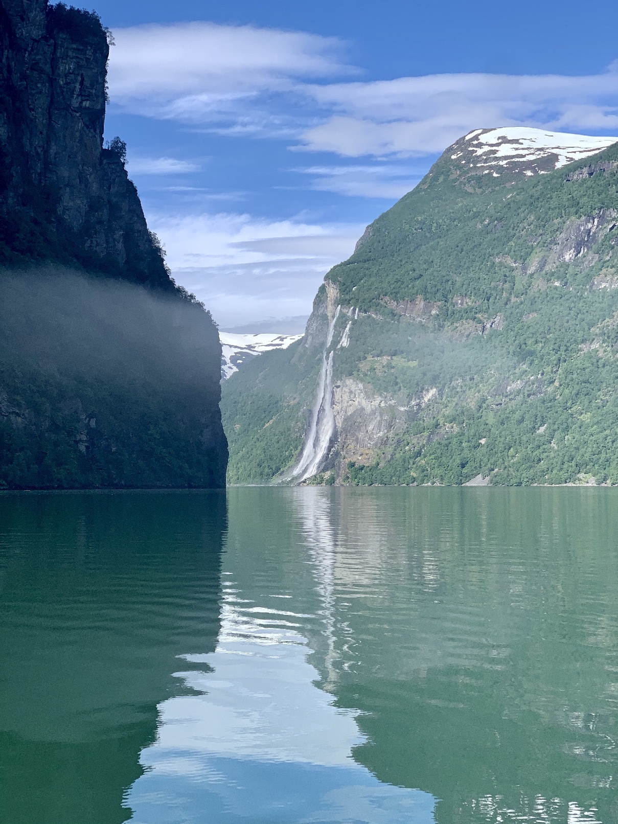 - Ущелье Флюдалсьювет (The Flydal Gorge) — культовая смотровая точка, откуда открывается один из самых узнаваемых видов Норвегии.