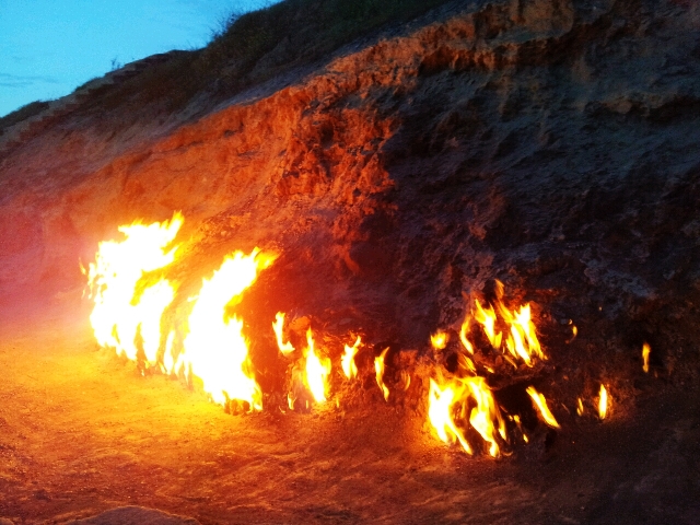 Завершим мы наше путешествие в глубь истории посещением горы Янардаг. Это одна из самых удивительных природных достопримечательностей Апшеронского полуострова. Она представляет собой охваченный пламенем склон горы, который невозможно потушить ни дождем, ни засыпать песком, горящий на протяжении уже нескольких тысячелетий. Пугающий и одновременно завораживающий огненный пейзаж на самом деле объясняется очень просто: из верхних слоев почвы выделяется природный газ, при соприкосновении с кислородом превращающийся в неугасимый пламень. Тем не менее, гора Янардаг до сих пор является чудом и объектом поклонения для последователей культа огня со всего мира.