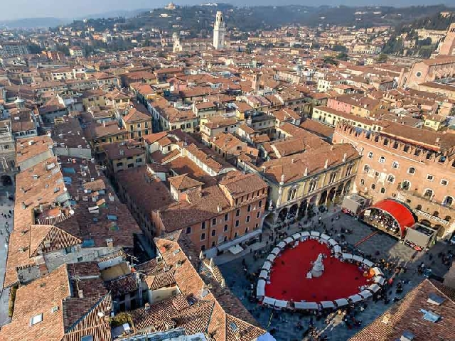 Затем, пройдясь по виа Маццини (центральной торговой улице города), вы попадаете на площадь Эрбе, с фонтанами, площадь Данте, далее Арке Скалиджери — фамильный склеп династии Ла Скала (известных правителей Вероны), романтический, известный на весь мир дом Джульетты, построенный в 13 веке, предоставляет собой типичный аристократичный особняк того времени. Считается, что прикосновение к статуе приносит удачу в любви. Во дворик, бывший некогда садом Капулетти, выходит небольшой каменный балкон — знаменитый балкон Ромео и Джульетты. Поцелуй под этим балконом — мечта многих влюблённых пар, которые оставляют на стенах Дома свои автографы в виде сплетённых вместе имён и сердечек.