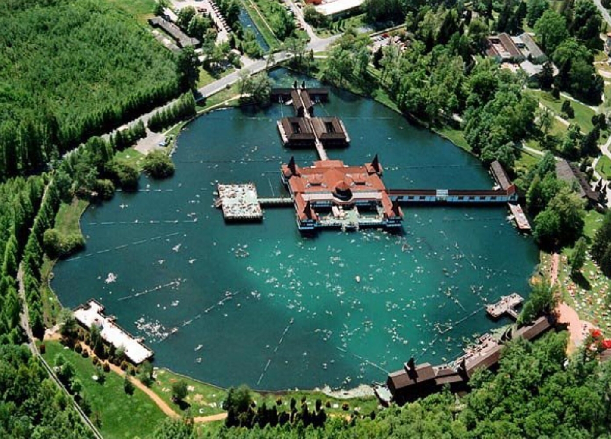 В Хевизе предусмотрено 1–2 часовое купание в одноимённом, уникальнейшем по химическому составу биоактивном лечебном чудо-озере, достигающим зимой и летом температуры 31–33 градусов. Ценнейшая целебная вода таким мощным потоком извергается из недр земли, что за 27 часов в этом уникальном «круглогодичном», самом большом термальном купальном озере в мире, она полностью обновляется. Разумеется, искупаться в озере в кратере, (хоть и погасшего 5,5 миллионов лет назад, но всё ещё вяло-вяло действующего,) вулкана Хевиз приятно во все времена года при любой погоде, (например в проливной дождь), но особенно аттрактивно поплавать среди разноцветных водяных лилий зимой, в мороз или в снегопад…