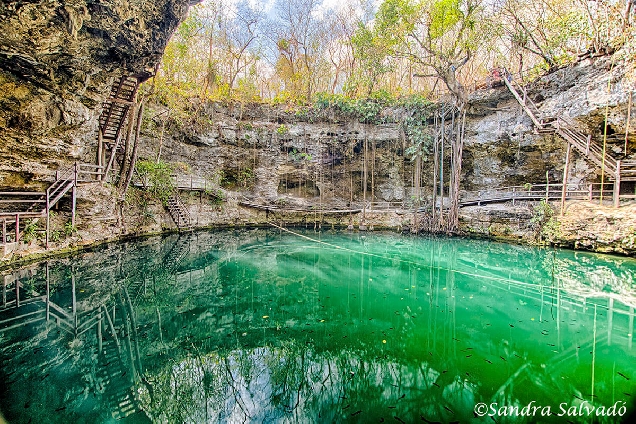Огромным плюсом является наличие сенота Шканче, расположенного в 1,5 километрах от основной пирамиды города Черного Ягуара. На велосипеде, рикше или просто пешком по исторической дороге Сакбе мы попадаем в это изумительное место. Сенот сохранил первозданный вид, были только добавлены деревянные помосты, тарзанка и лестница для спуска, опять же максимально интегрированные в общий вид озера. Дорога Сакбе и сенот принадлежит общине Майя, которая старается максимально сохранить природный объект.