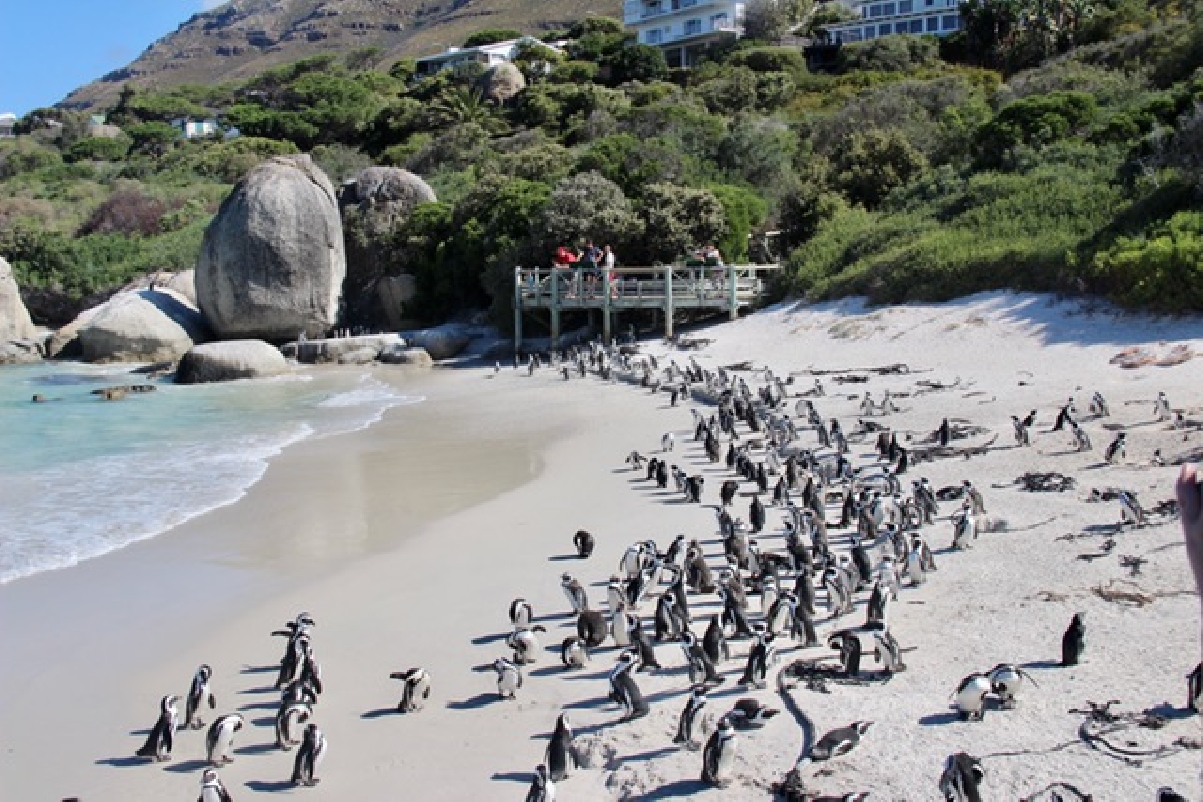 В очень красивом месте на краю земли, недалеко от Кейптауна, рядом с Мысом Доброй Надежды находится удивительное место – пляж Boulders Beach. Здесь, в небольшой лазурной бухте, окаймленной живописными гранитными валунами, в прибрежных зарослях и прямо на песке живут африканские пингвины – довольно крупные, до семидесяти сантиметров в высоту и пяти килограмм весом черно-белые птицы.