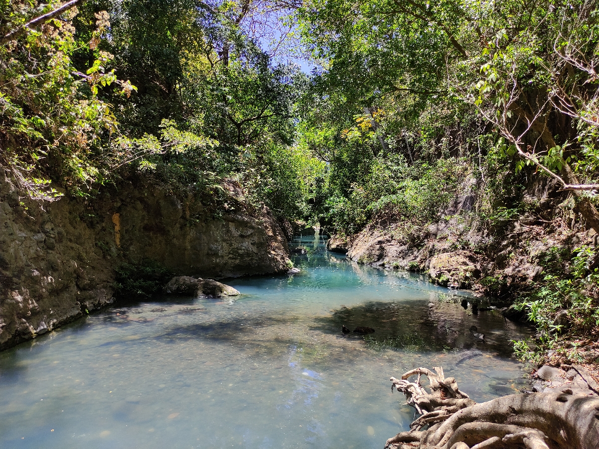 Гуанакасте, по дороге на вулкан Ринкон-де-ла-Вьеха. Этот спот находится на частной территории и его обозначения нет на карте. Туристы вообще не знают про это место. Сюда мы водим исключительно в виде тура от нашей компании, потому-что если даже ткнуть на это место на карте, найти его будет невозможно или очень сложно. Тут есть прекрасный, прохладный, глубокий бассейн в с чистейшей водой и цветом нереальной бирюзы. Можно проплыть 200 метров против течения и попасть на прекрасный водопад, а если знать тропу и обойти его, то попадешь еще в один секретный каньон неописуемой красоты. Но надо помнить, что обратная дорога будет только по воде, для чего придется совершить два прыжка в водопады. Это захватывающая экскурсия, которую мы включаем в индивидуальные туры.