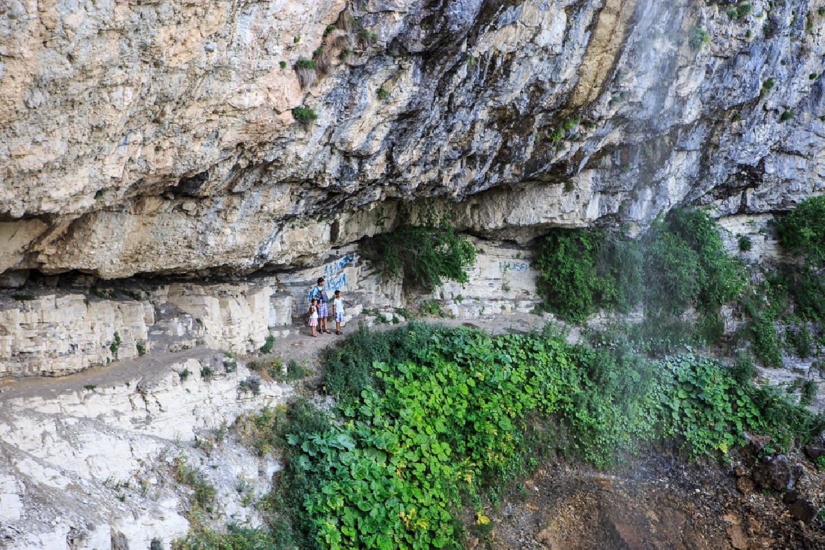 Наверху оборудована небольшая зона отдыха с беседками и мангалами. Отсюда идти только пешком по грунтовой дороге. К счастью, уже минут через 10-15 вы увидите серебристую ленту Афурджинского водопада. Он расположен таким образом, что туристы могут зайти за него, чтобы полюбоваться радугой в каплях воды. По дорожке, ведущей вниз, можно спуститься к подножию, где потоки воды разбиваются о камни, превращаясь в небольшую речку.