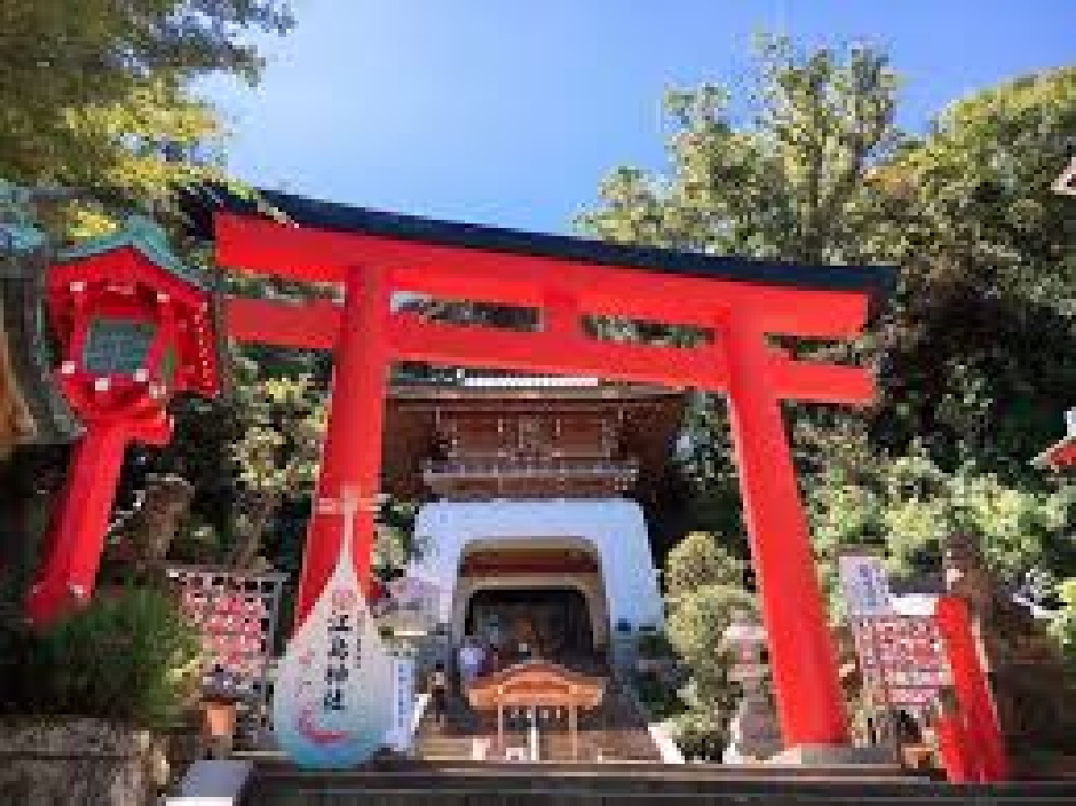 Остров вулканического происхождения увенчан изображением драконов, ведет к главному святилищу богини Бэнтэн, одной из семи богов счастья.