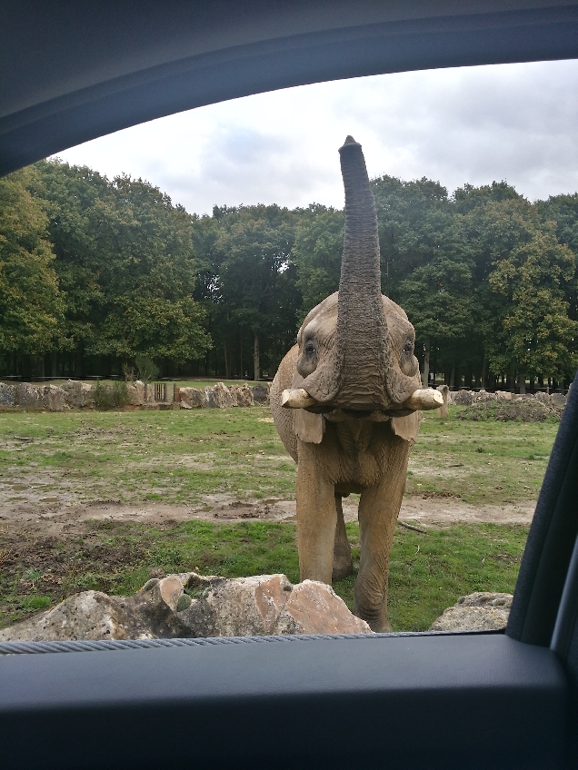 Под Парижем, в тридцати километрах, есть симпатичное местечко, т.е. деревушка под названием Туари. И настоящий дубовый лес 140 гектар. И в этом лесу живут разные экзотические животные. Да, да, практически на свободе. И они очень вежливые, и самое главное, что очень воспитанные. Вот слоник, говорящий спасибо, после предложенной ему булки.