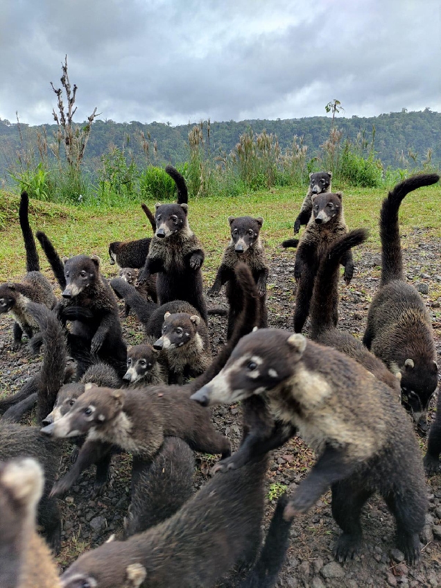 Носухи (местное название писоте ) просят еду у туристов под вулканом Поас