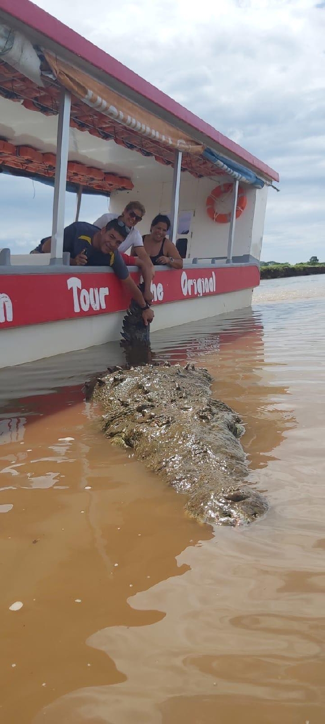 Гид делает запрещенный в Коста-Рике маневр и трогает 950 килограмового 6 метрового крокодила за хвост.