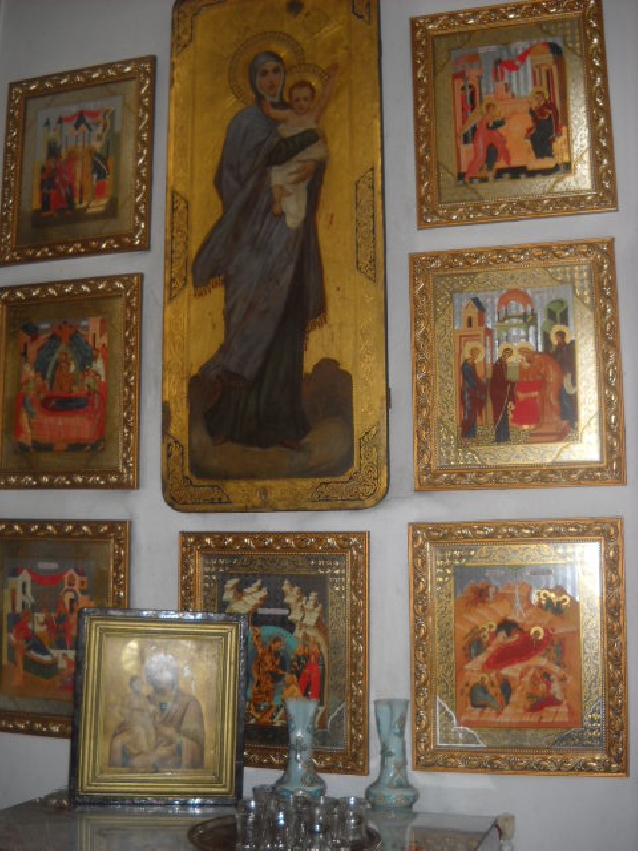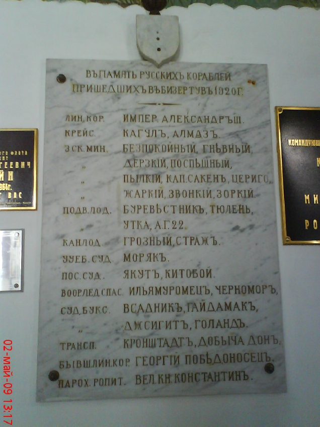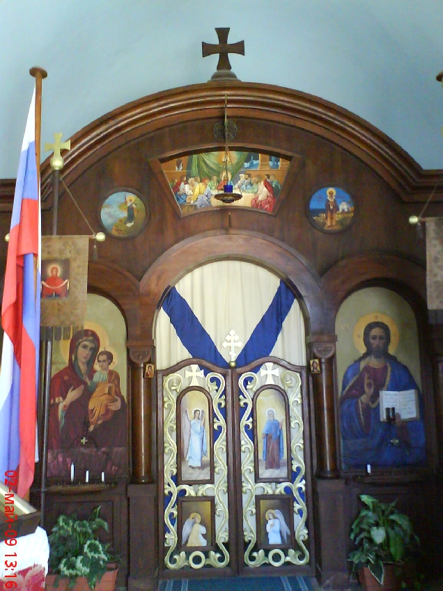 Алтарь бизертинской церкви, дело рук отца Анастасии Александровны Ширинской,капитана эсминца "Жаркий" -А.Манштейна. Андреевский флаг с эскадры был завесой на церковных вратах ,моряки называли его письмом к Богу.