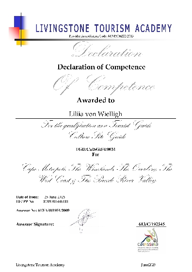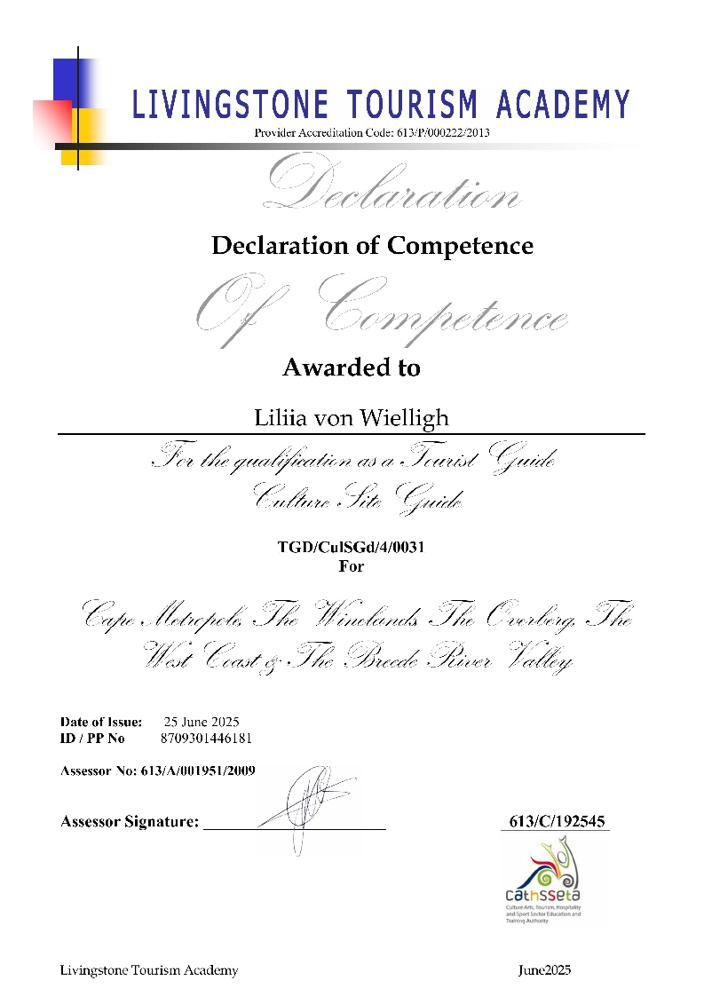 Моё образование — ИнЯз, я переводчик правительственного уровня и прошла курс подготовки гидов в ЮАР. Свободно говорю по-английски, изучила африкаанс, немного владею итальянским и французским. Меня увлекает история Южной Африки, а особая страсть — капские вина. Как сертифицированный сомелье, с радостью покажу вам красоты и вкусы винодельческих долин Кейптауна.